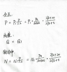 鼓風(fēng)機性能按t=20℃,大氣壓力po=101325pa,氣體密度p=1.2kg/m3時的空氣介質(zhì)計算。訂貨時以性能表為準(zhǔn),如鼓風(fēng)機的使用條件與上述不符時,性能應(yīng)按照下列公式進行換算。