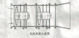 2、若用在較長的排氣管道內,可將風機間隔串聯(lián)安裝,如圖所示。以增高風壓,單兩臺風機不可相隔過遠。
